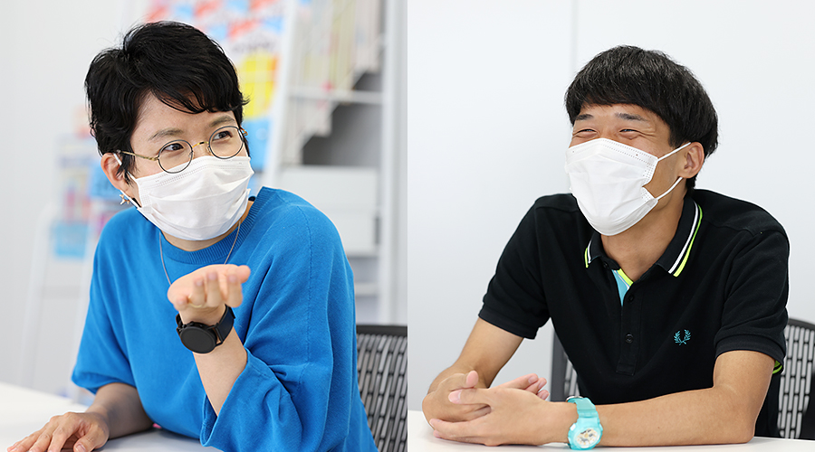 B:僕は、前職で教育系出版社の営業をしていたのですが、教育系といっても仕事で子どもと関わることはなく、イメージしていたのと違ったので転職を決意しました。もともと、子どもが好きで教育に携わりたかったというのもあって、楽しく学べる商品をつくっているくもん出版に入れば、教育に関する多くの経験が得られると思って入社しました。