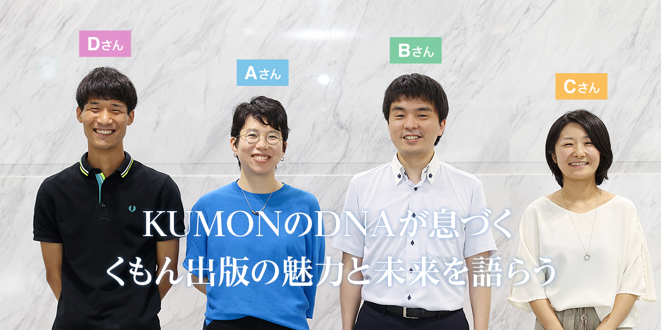 くもん出版という企業を選んだ背景から、働くうえでのやりがいや喜びは何か。また、働き方改革が進む昨今、仕事とプライベートの両立はどのように図っているのか――。企画開発部の各セクションで、キャリアを積みながら活躍し続ける4人の社員に、リアルなくもん出版について、語ってもらいました。